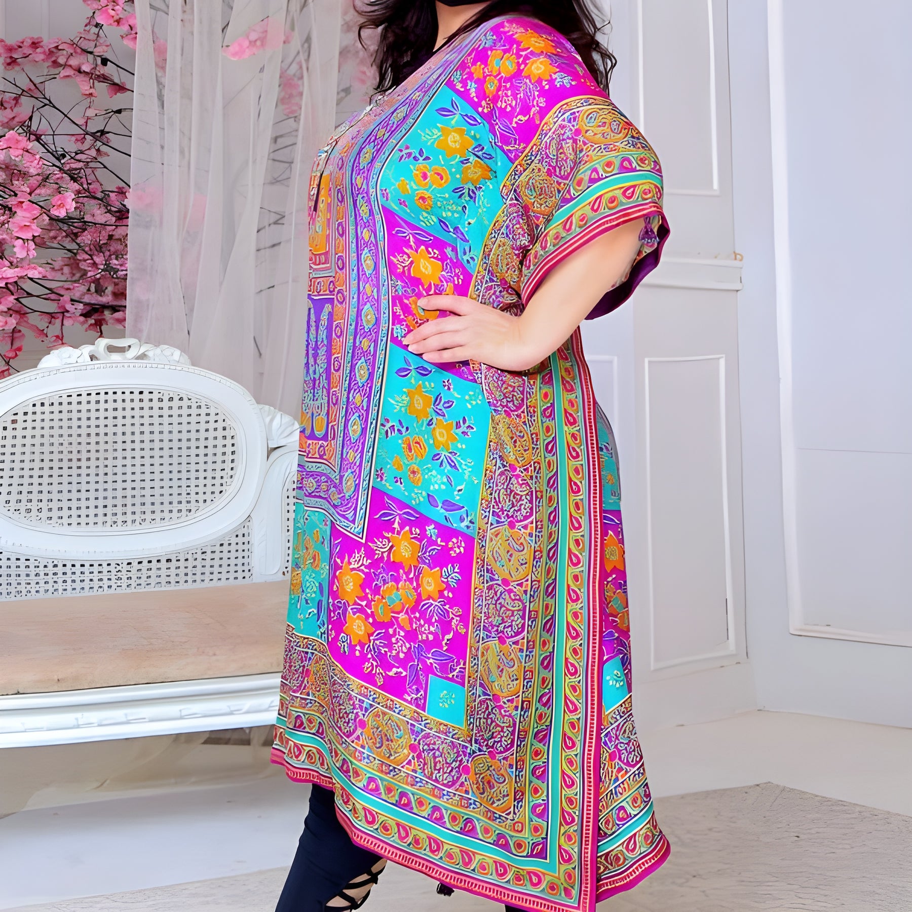 The tie-dye pattern can create a sense of playfulness and fun, making it an ideal choice for beach or poolside activities, as well as casual outings. The caftan or poncho can be worn over a swimsuit or paired with shorts or a skirt for a comfortable and stylish look.
