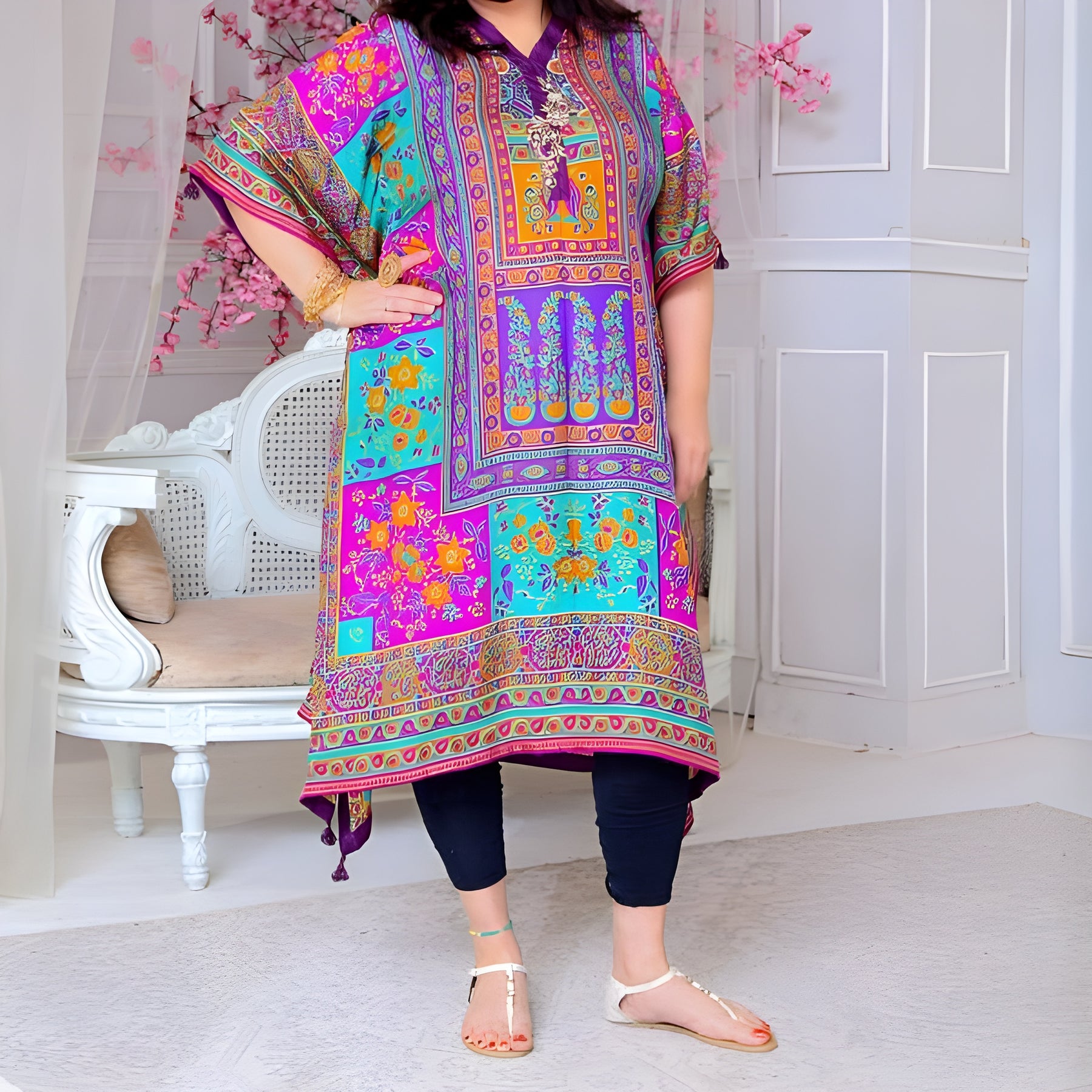 The loose and flowing fabric of the caftan or poncho can provide a sense of comfort and ease, making it a great choice for relaxed and casual occasions. Depending on the design, the kaftan or poncho can feature a range of stylish details, such as beading, embroidery, or other embellishments that can add an extra layer of luxury and uniqueness.